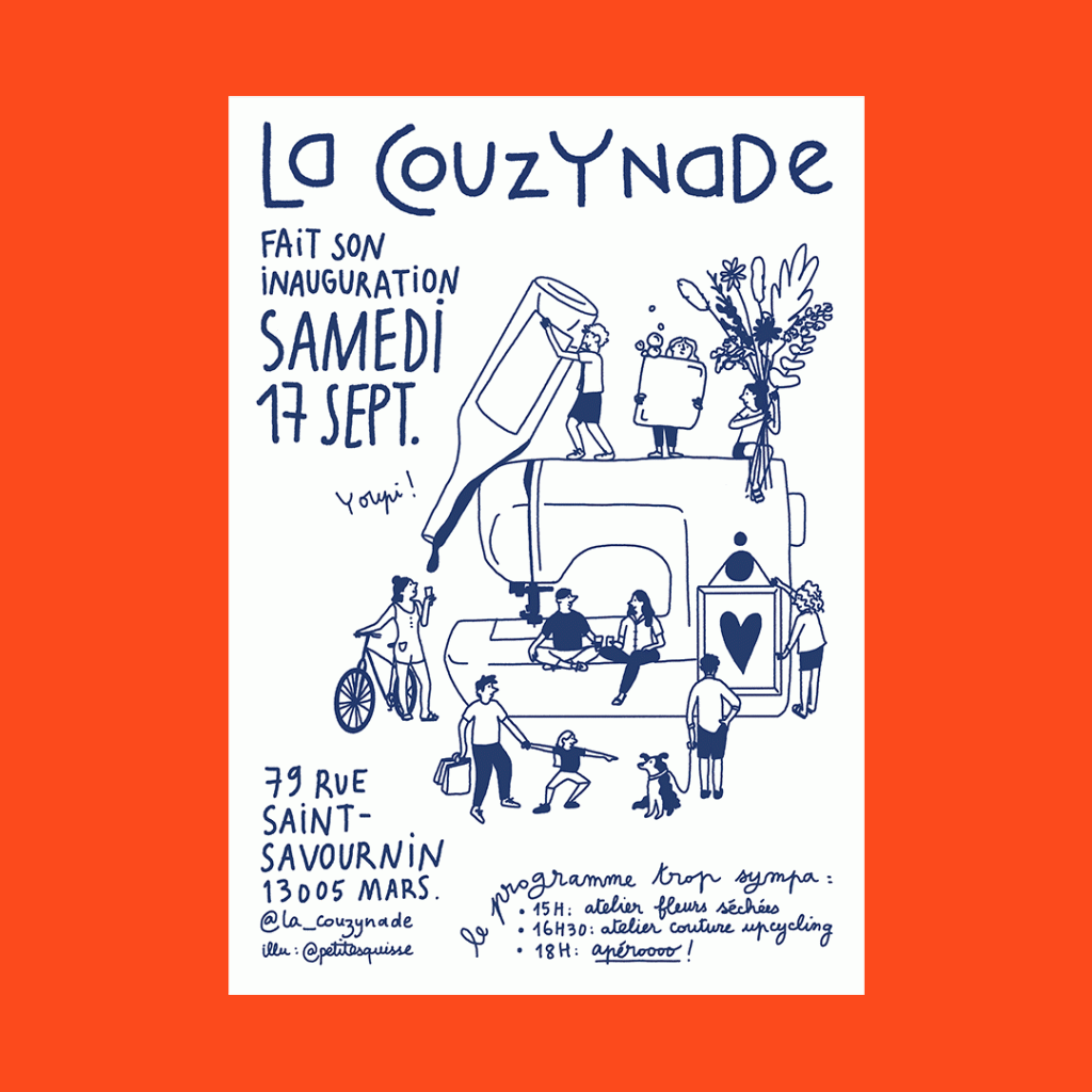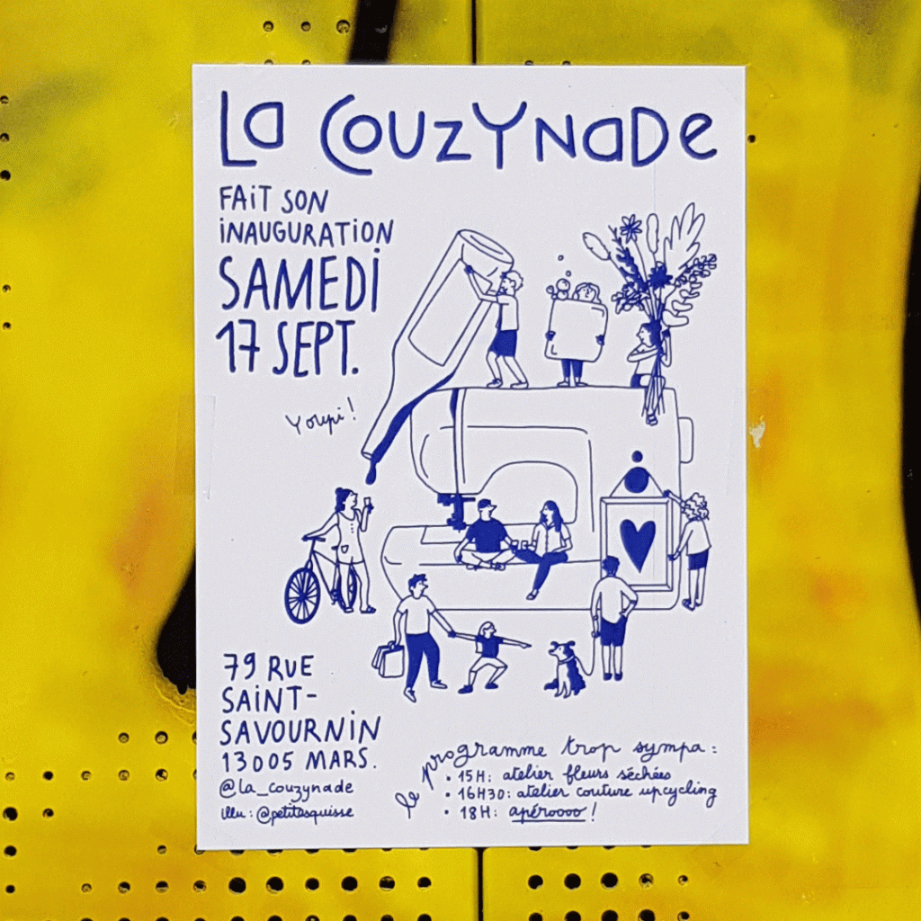 Réalisation d’une affiche pour l’inauguration de la boutique de créateur.ice.s La couzynade. C’est un lieu tenu par les personnes qui y exposent leurs créations, et dont je fais partie.