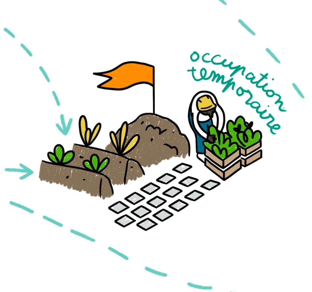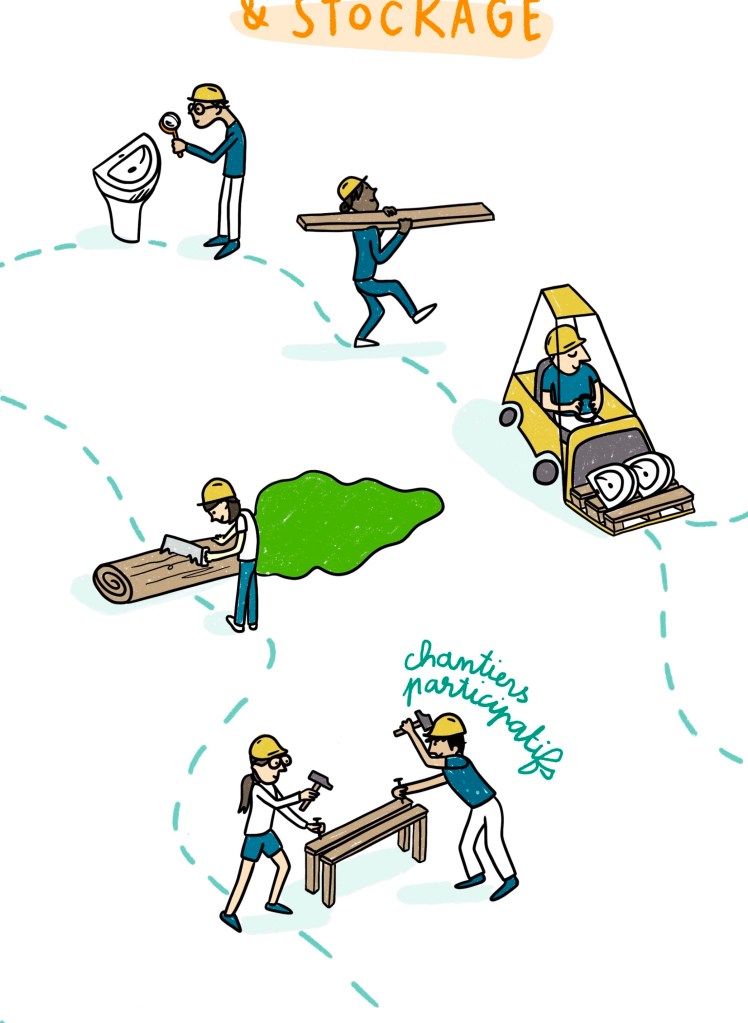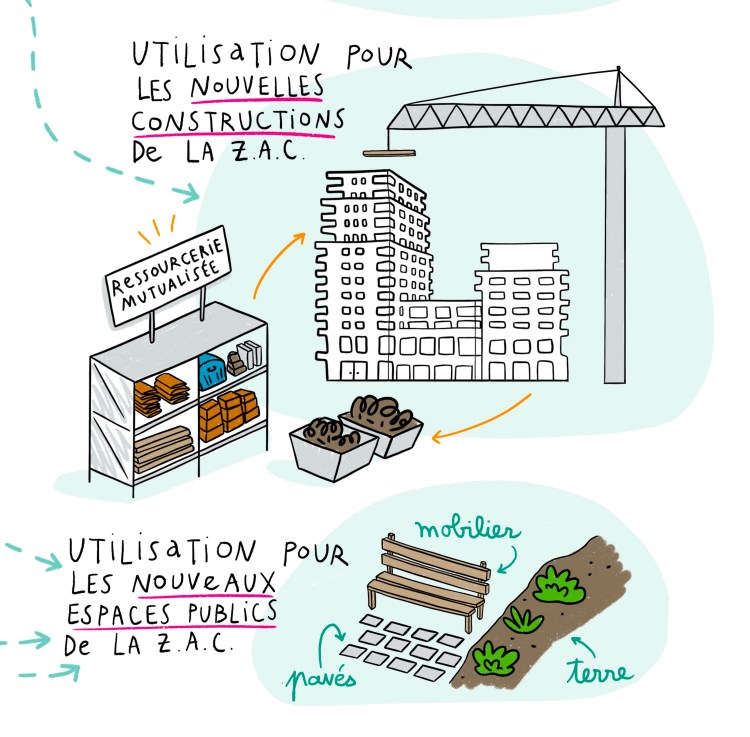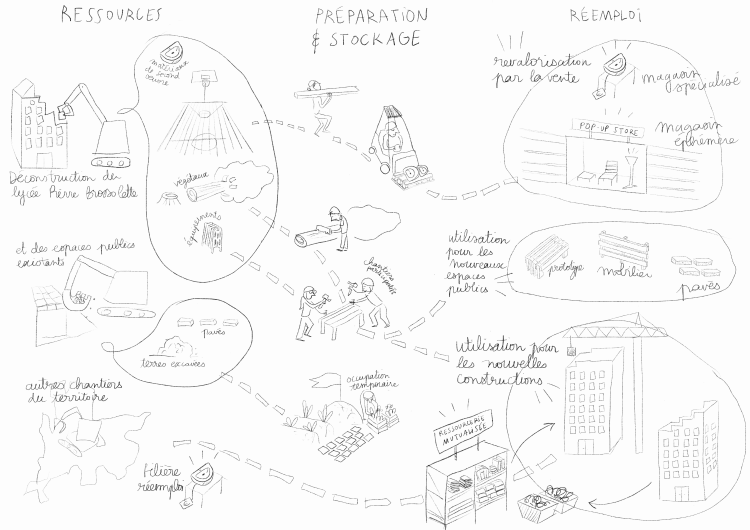 L’objectif était de représenter les différentes étapes de l’utilisation de matériaux et équipements de réemploi dans un projet d’aménagement urbain neuf.