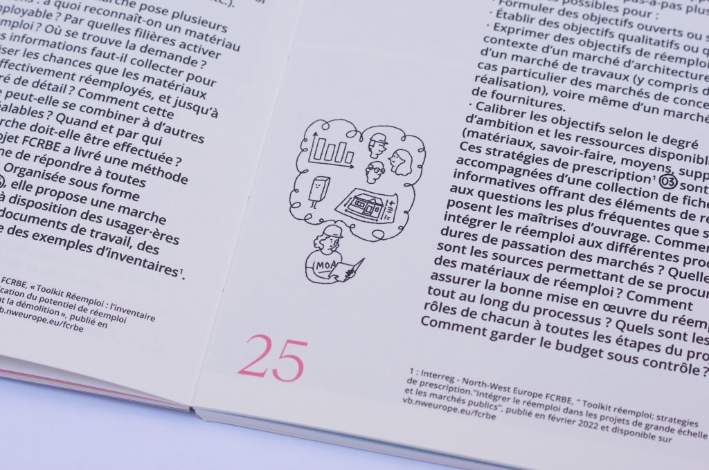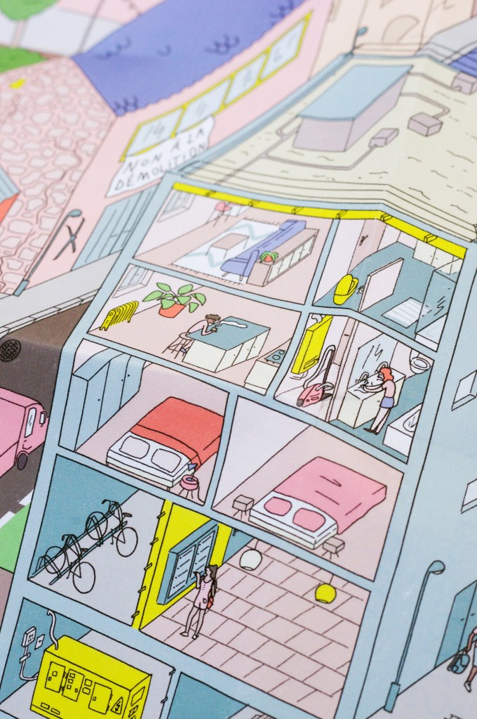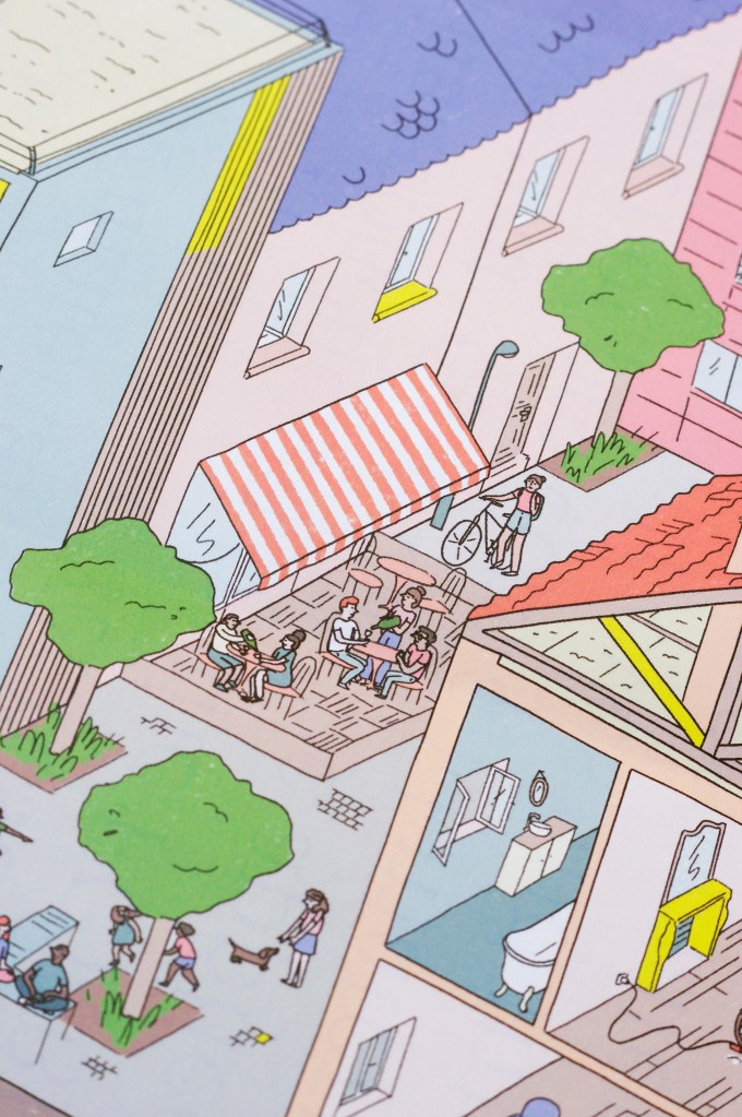Camille Moreau, directrice artistique et graphiste du projet, m’a contactée pour réaliser des illustrations au sein de l’ouvrage ainsi qu’un des 2 posters. « Reuse City » présente une ville pleine de matériaux de réemploi à rechercher dans l’image à la manière d’un Où est Charlie.