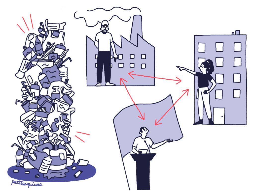 Montrer également l’autre versant grâce au triangle de l’inaction : pendant que tout le monde se renvoie la responsabilité, politiques, industriels et citoyens, le problème de la pollution plastique continue de s’accroître.